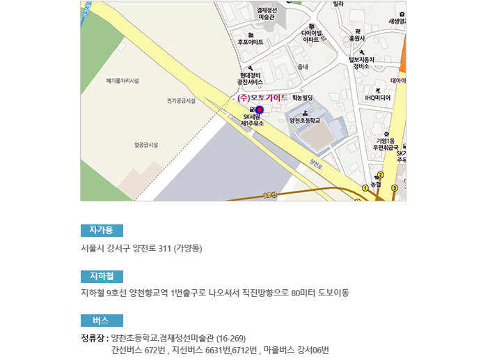 서울특별시 강서구 양천로 311 (가양동) (주)오토가이드 우편번호 07523 (주)오토가이드 | 대표이사 정봉표 | 사업자등록번호 112-86-00350 |
